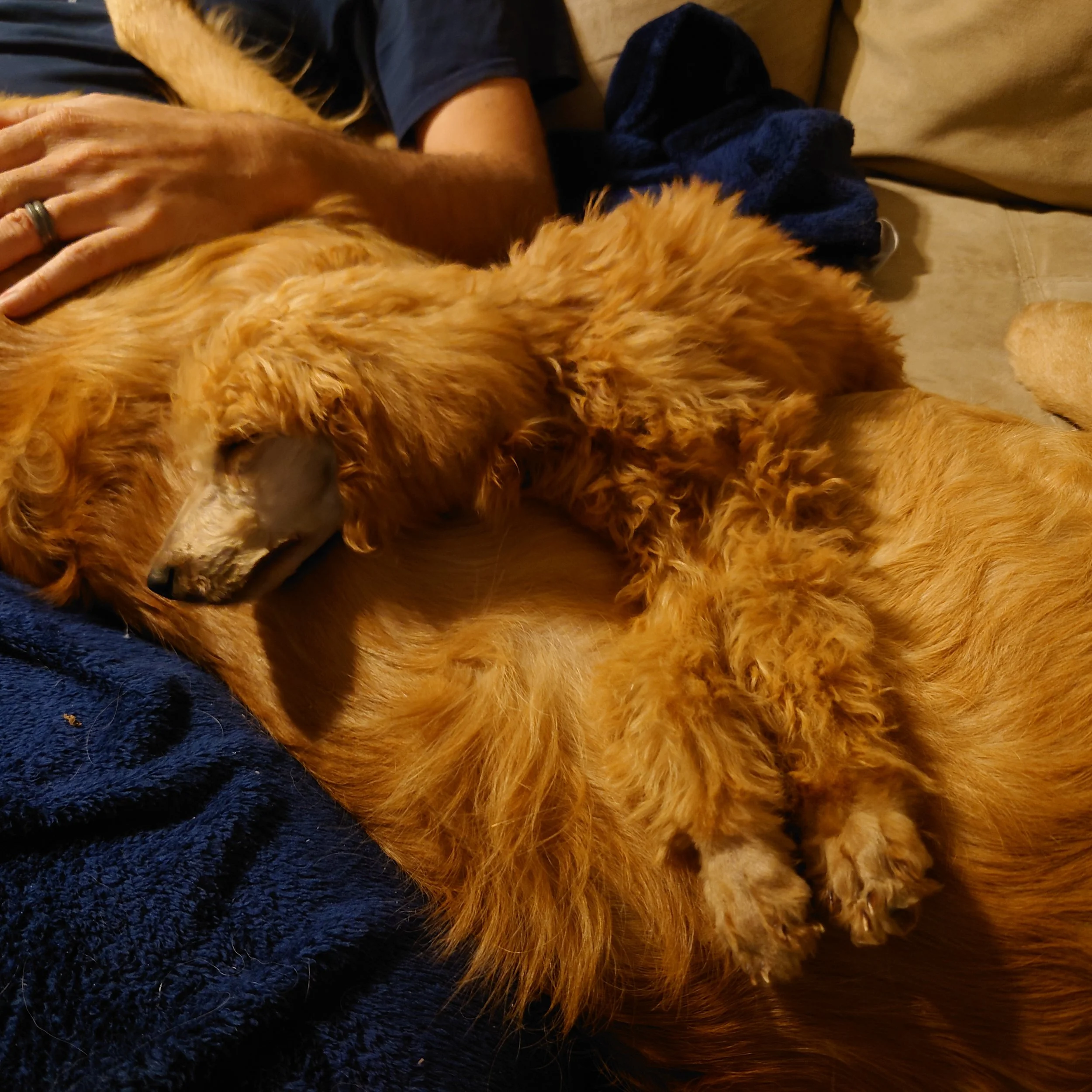 Sonja the Red Poodle blends into Ziggy, the Golden Retriever.
