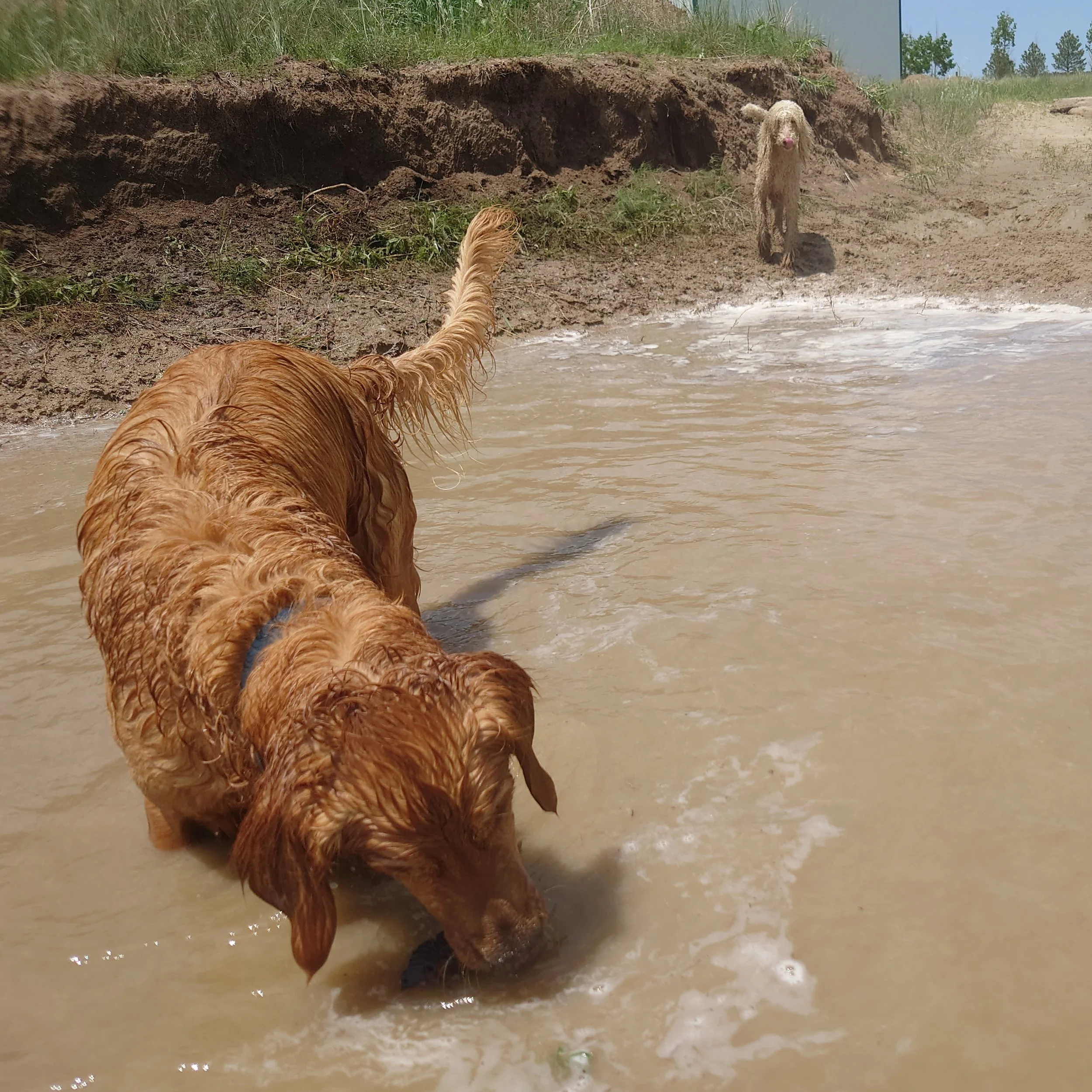 Ziggy, the Golden Retriever plays in the flood waters with Freya, the Standard Poodle behind him.