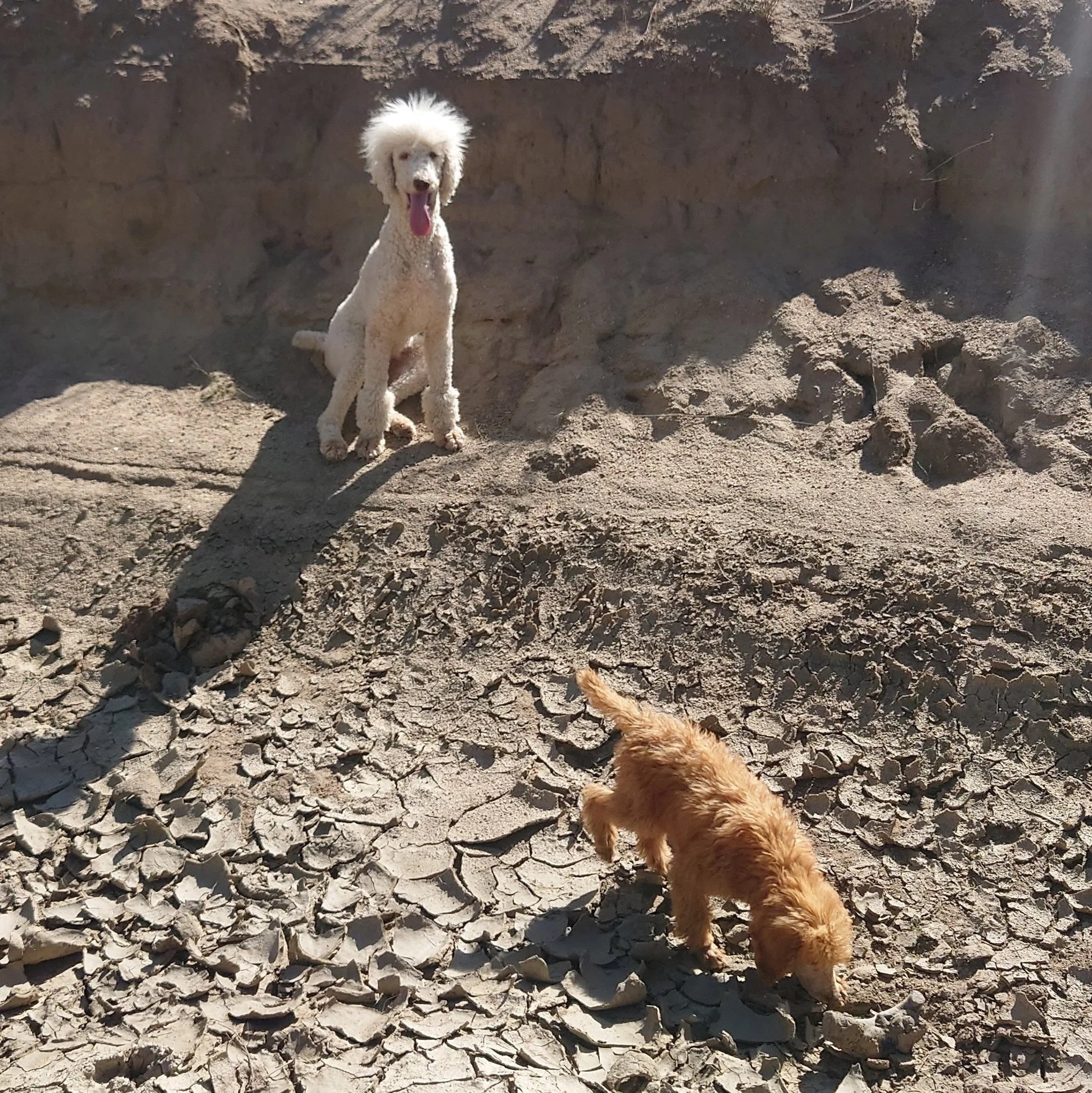 Freya, the white poodle watches over Sonja, the red poodle.