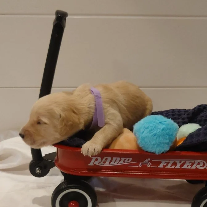 I was born February 28th, 2026. I am a female. My parents are, Standard Poodle Mom: Freya and Golden Retriever Dad: Ziggy. I am a F1 Goldendoodle.